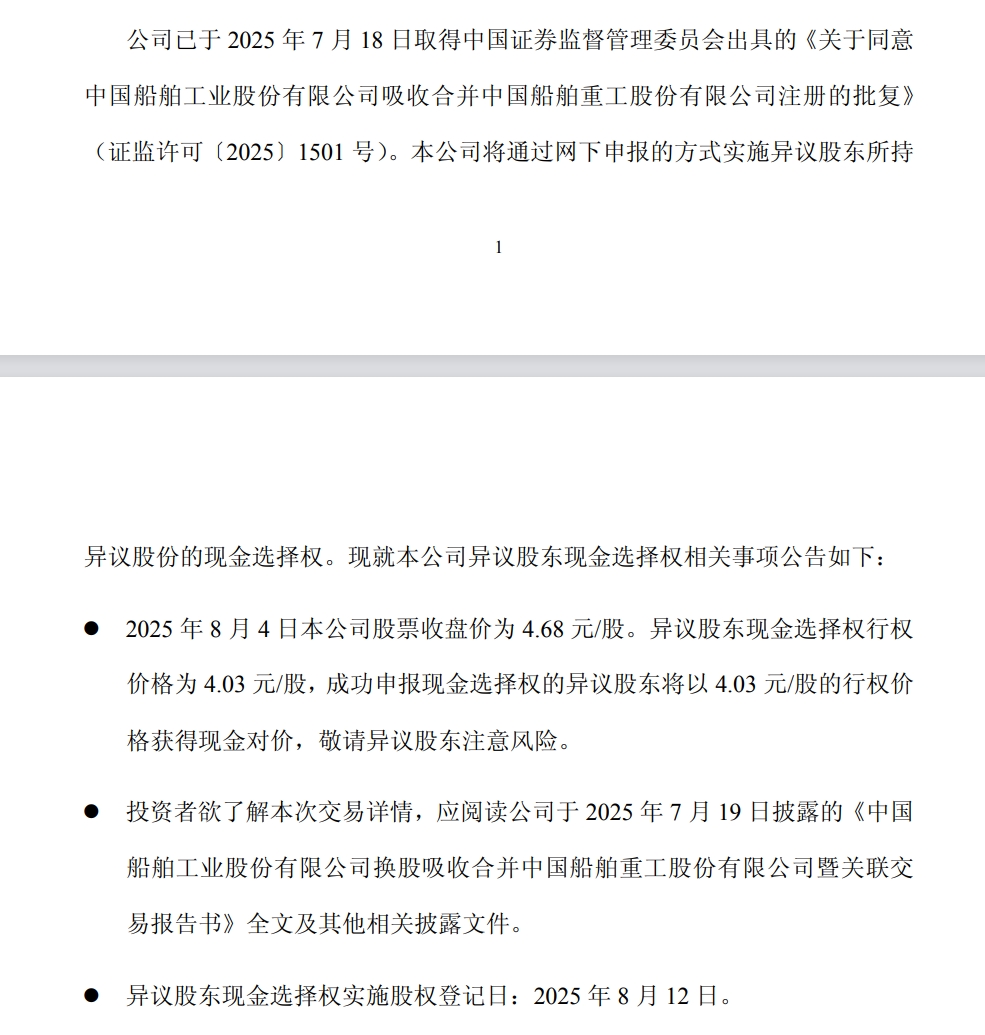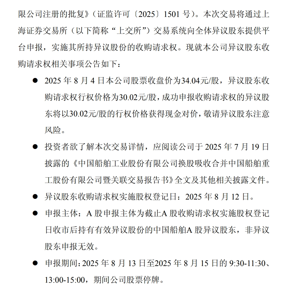 根據最新公告,中國船舶的異議股東收購請求權行權價格為30.02元/股,中國重工的異議股東現金選擇權行權價格為4.03元/股。成功申報的異議股東將以各自的行權價格獲得現金對價,實施股權登記日為8月12日。