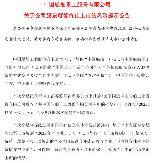 此外,中國重工還公告,本次交易將導致公司不再具有獨立主體資格並被注銷,根據《上市規則》《上海證券交易所上市公司自律監管指南第2號——業務辦理(2025年4月修訂)》之第九號現金選擇權的規定,公司將於現金選擇權申報截止日的次一交易日向上交所提交主動終止上市申請。